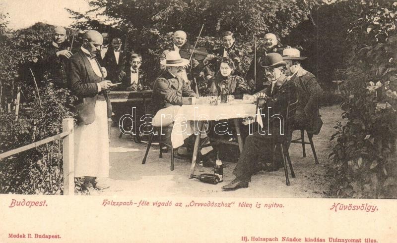 Budapest II. Hűvösvölgy, Holtzspach Orvvadász vendéglő, étterem, kert, pincérek, zenekar. Medek R., Ifj. Holzspach Nándor kiadása (szakadás / tear)