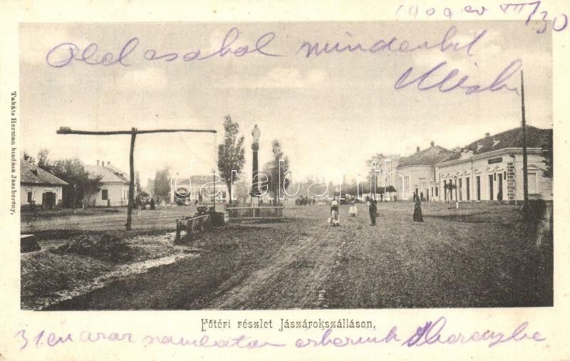Jászárokszállás, Fő tér, Gyógyszertár, gémeskút, üzletek. Takáts Herman kiadása (EK)
