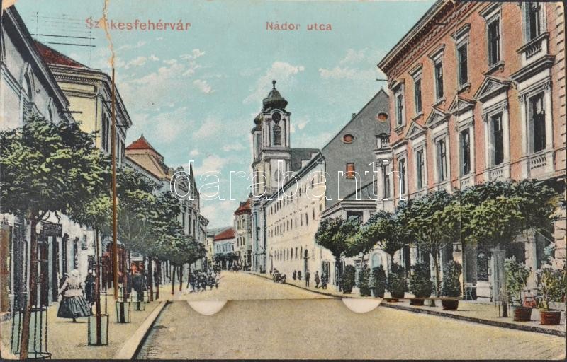 Székesfehérvár, Nádor utca. leporellólap, belül: Városház tér, piac, Színház, Vörösmarty tér, Püspöki palota, Ligetsor, Igazságügyi Palota, Szeminárium (szakadás / tear)