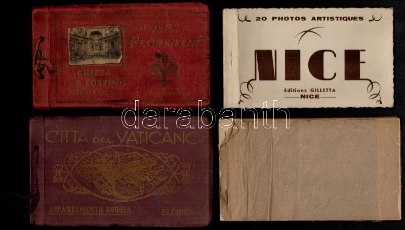Description: 4 db régi olasz és francia képeslap album / 4 pre-1945 Italian and French postcard albums, booklets: Nizza (Nice), Firenze, Vatican City and 1 incomplete Italian art postcard album