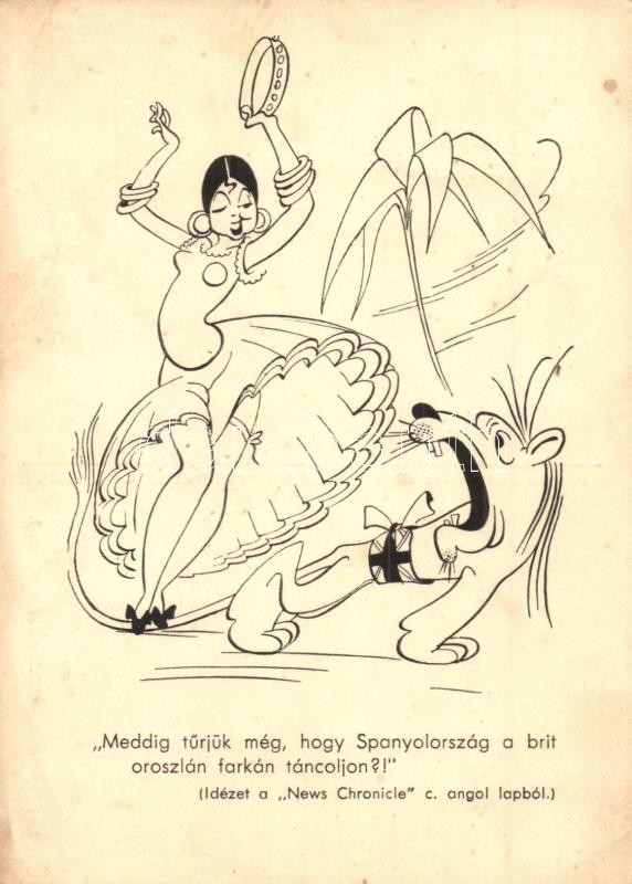 Meddig tűrjük még, hogy Spanyolország a brit oroszlán farkán táncoljon... https://www.darabanth.com/en/318-Online-auction/318.0/Postcards/Propaganda-politics~2500074/Meddig-turjuk-meg-hogy-Spanyolorszag-a-brit-oroszlan-farkan-tancoljon-Idezet-a-News-Chron~II1750954