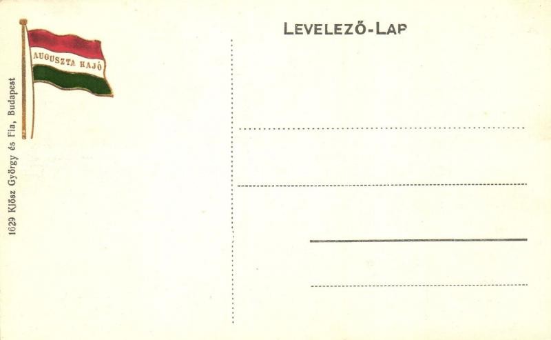Description: Deák Ferenc, I. Ferenc József, Margit, Visegrád termes gőzösök. Díszes MFTR reklám képeslap hátoldalán Auguszta hajós dombornyomott zászlóval / Hungarian steamship, Danube ship company advertisement