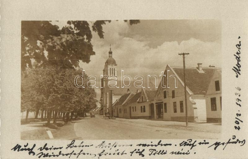 Description: 1936 Modor, Modra; utcakép templommal, M. Pridala üzlete / street view with church and shop. photo + "Oslavy Pamiatky 80. Vyrocia Smrti Ludovíta Stúra" So. Stpl