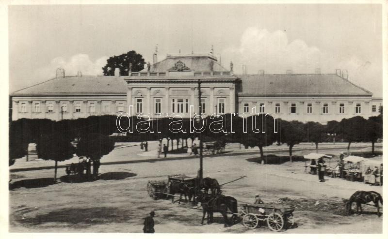 Ipolyság, Sahy; Megyeháza, piac, árusok / county hall, market vendors ...