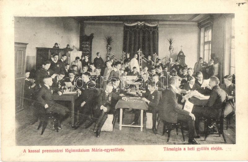 Description: Kassa, Kosice; A premontrei főgimnázium Mária egyesülete, társalgás a heti gyűlés elején, belső. Varga Bertalan kiadása / grammar school student organization's weekly gathering, interior (EK)