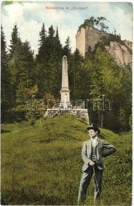 Description: Murány, Murányalja, Muránsky hrad; Vár és 1848-49-es honvéd emlékmű, obeliszk. Az 1849. február 26-ai Murány és Tiszolc közötti csatára emlékére állították 1899-ben. Fehér Dezső kiadása / castle, memorial obelisk of the Hungarian Revolution in 1848 (r)