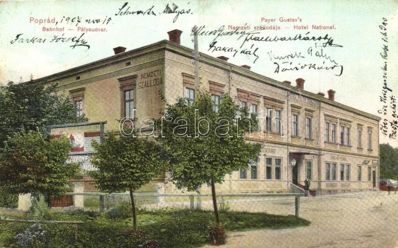 Description: Poprád (Tátra), Bahnhof / Vasútállomás, Pályaudvar, Payer Gustav Nemzeti szálloda, kávéház és étterem / Hotel National, café and restaurant, railway station (EK)