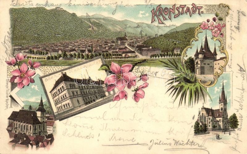 Description: 1898 Brassó, Kronstadt, Brasov; Evangélikus templom, Református templom, Katalin-kapu, iskola / churches, old city gate, school. Ottmar Zieher floral Art Nouveau litho (Rb)