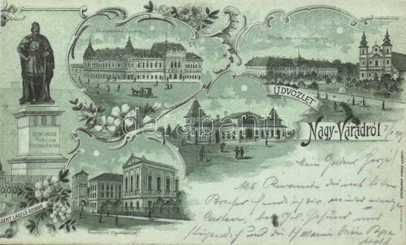 1899 Nagyvárad, Oradea; Szent László szobor, Kereskedelmi csarnok, Püspöki palota és székesegyház, Sport pavilon, kerékpár, Premontrei Főgimnázium / statue, market place, bishop's palace, cathedral, sports pavilion, bicycle, grammar school (vágott / cut)