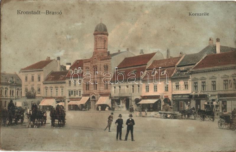 Brassó, Kronstadt, Brasov; Kornzeile, Schutzengel Apotheke / Búzasor, Gyógyszertár, W. Hiemesch üzlete, munkások létrán cégér festés közben. Eduard Kerschner kiadása / street view, pharmacy, shops, workers paint name plates, ladder (r)