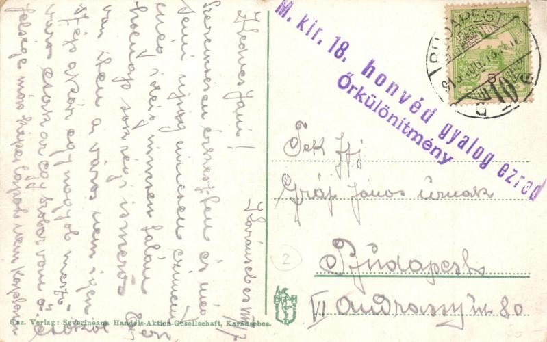 Description: Karánsebes, Caransebes; királyi szobor, Vagyonközösség palotája / Monumentul regelui, Palatul com. de avere / statue, financial palace + M. Kir. 18. honvéd gyalogezred őrkülönítmény (EK)