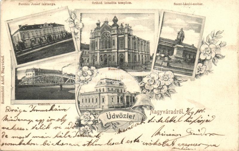 Nagyvárad, Oradea; Ferenc József laktanya, Orthodox izraelita templom, zsinagóga, Szent László szobor, múzeum / military barracks, synagogue, statue, museum. Art Nouveau, floral