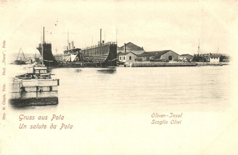 Description: Pola, Olíva sziget a hadihajógyárral, hadihajó a szárazdokkban / K.u.K. Kriegsmarine battleship factory, Scoglio Olivi, battleship in the dry dock. M. Clkapis, Pola Phot. Flora