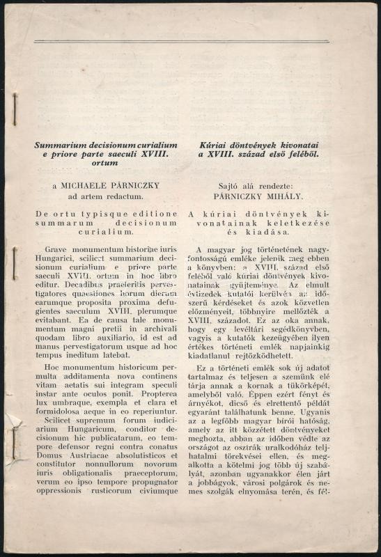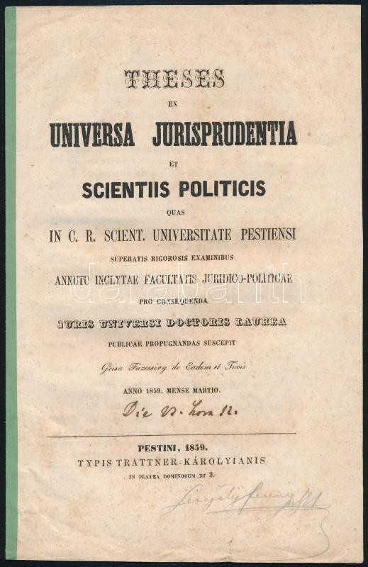 Vegyes könyvtétel, 2 db jogi munka: tövisi és füzesséri Füzesséry Géza (1831-1909): Theses ex universa jurisprudentia et scientiis politicis, quas in C. R. Scient. Universitate Pestiensi superatis rigorosis examinibus annutu inclytae Facultatis Juridico-Politicae pro consequenda juris universi doctoris laurea. Pest, 1859, Trattner-Károlyi, 8 p. Latin nyelven. Párniczky Mihály: Kúriai döntvények kivonatai a XVIII. sz. első feléből. (In: Agrártudományi Egyetem Mezőgazdaságtudományi Karának évkönyve. Bp., 1951, Mezőgazdasági kiadó), 207-278 p. A munka teljes, de az évkönyv töredékes, a többi része hiányzik.