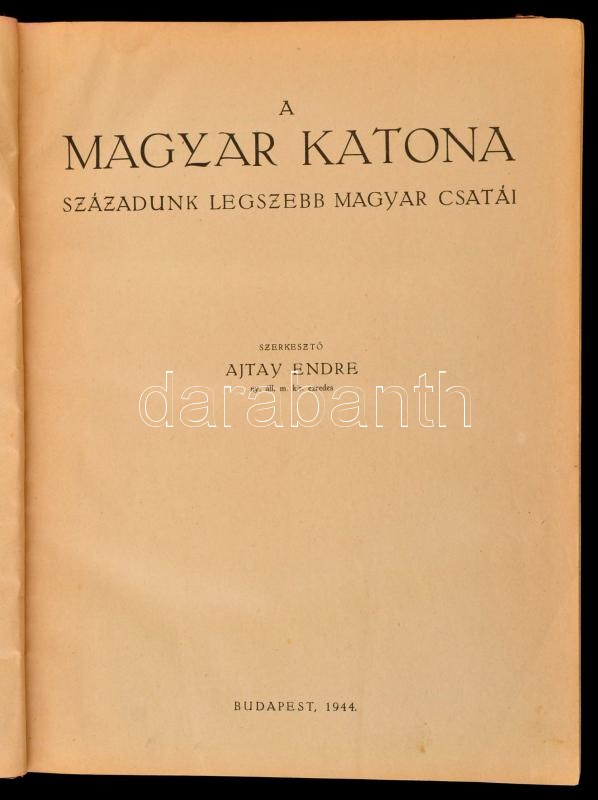 A magyar katona. Századunk legszebb magyar csatái. Szerk.: Ajtay Endre. Bp., 1944, Élet Irodalmi és Nyomda Rt. Fekete-fehér fotókkal illusztrált. Kiadói aranyozott, illusztrált félvászon-kötés, kopott borÃtóval, sérült gerinccel.