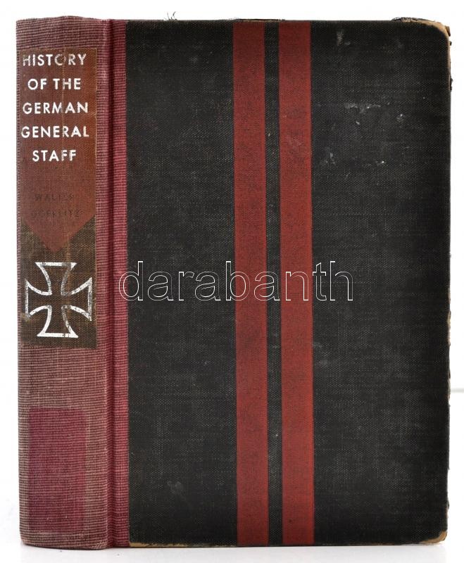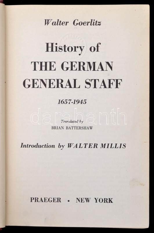 Walter Goerlitz: History of The German General Staff 1657-1945. Fordította: Brian Battershaw. Walter Millis bevezetőjével. New York, 1954, Praeger. Fekete-fehér fotókkal. Angol nyelven. Kiadói kopott félvászon-kötés, intézményi bélyegzővel. /Walter Goerlitz: History of The German General Staff 1657-1945. Translated by Brian Battershaw. Introduction by Walter Millis. New York, 1954, Praeger. Black-and-white photographs. Half-linen-binding, with worn cover, in English language, with stamps.