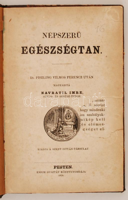 Dr. Piszling Vilmos Ferencz [Pissling, Wilhelm Franc]: Népszerű egészségtan. MagyarÃtá Navratil Imre. Pest, 1858, Szent István Társulat. Emich Gusztáv Könyvnyomdája. Kopottas félvászon kötés, 2+160+4 p. Egyetlen magyar kiadás. A borÃtója kopott. A cÃmlapja sérült. De ezt leszámÃtva jó állapotban van.