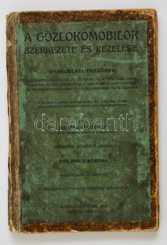 Naszályi József: A gőzlokomobilok szerkezete és kezelése. Gyakorlati tankönyv. Székesfehérvár, 1918, Szerző. Félvászon kötés, foltos, széteső állapotban.