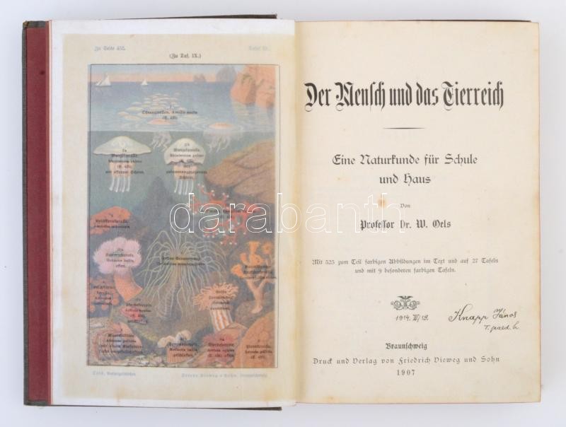 Description: Dr. W. Oels: Der Mensch und das Tierreich. Eine Naturkunde für Schule und Haus. Druck und Verlag von Friedrich Vieweg und Sohn, 1907, Braunschweig. Mit vielen farbigen Abbildungen, im guten Zustand // német nyelvű rendszertani szakkönyv számos litho és rézmetszet illusztrációval, kiadói egészvászon kötés, apró foltokat eltekintve jó állapot, tulajdonosi bejegyzéssel, 470 p.