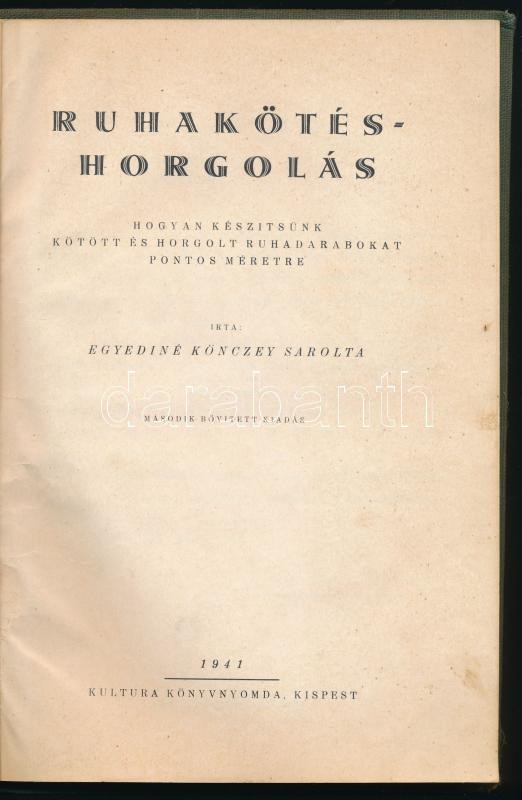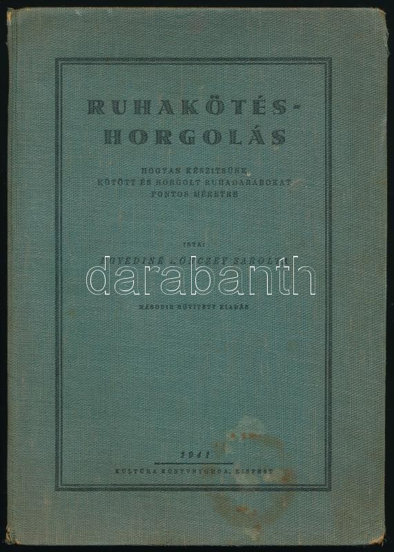 Description: Egyediné Könczey Sarolta: Ruhakötés-horgolás. Hogyan készítsünk kötött és horgolt ruhadarabokat pontos méretre. Kispest, 1941, Kultura. Második, bővített kiadás. Kiadói egészvászon-kötés, kissé foltos borítóval, kissé sérült gerinccel, egy helyen ceruzás jegyzettel.
