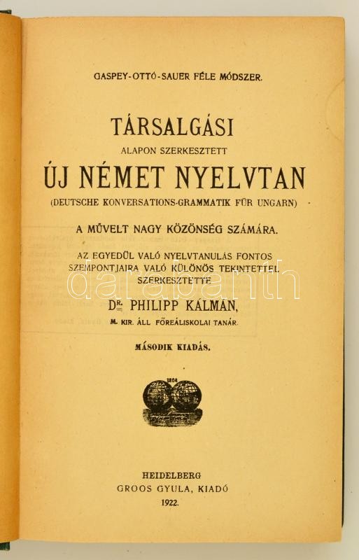 Description: Dr. Philipp Kálmán: Társalgási alapon szerkesztett új német nyelvtan. (Deutsche konversations-grammatik für Ungarn.) Tankönyvsorozat Gaspey-Otto-Sauer módszer. Heidelberg, 1922, Groos Gyula. Kiadói egészvászon-kötés, kissé kopottas borítóval. Jó állapotban.