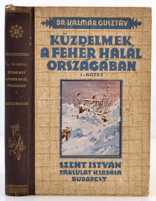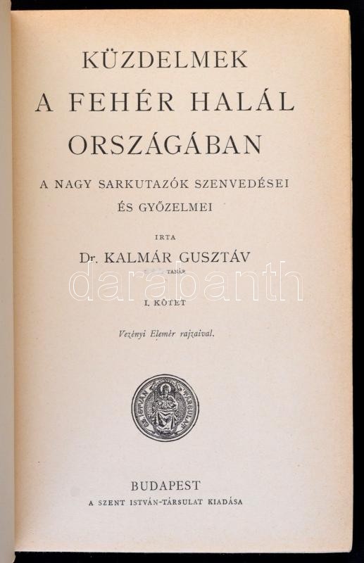 Dr. Kalmár Gusztáv: Küzdelmek a fehér halál országában I. kötet. A nagy sarkutatók szenvedései és győzelmei. Vezényi Elemér rajzaival. Budapest, 1931, Szent István-Társulat, Stephaneum-ny. Kiadói egészvászon kötés, kissé kopással a borító sarkain, kis sérüléssel a gerincen, szövegközti képekkel és két kihajtható térképpel illusztrálva. Jó állapotban.