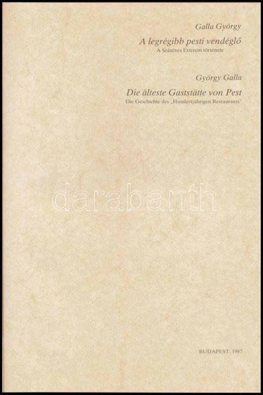 Galla György: A legrégibb pesti vendéglő. / Die alteste Gaststatte von Pest. Bp., 1987, Idegenforgalmi Propaganda és Kiadó Vállalat, 69 p. Kiadói fűzött kemény papírkötés, magyar és német nyelven.
