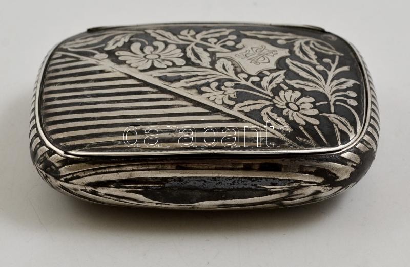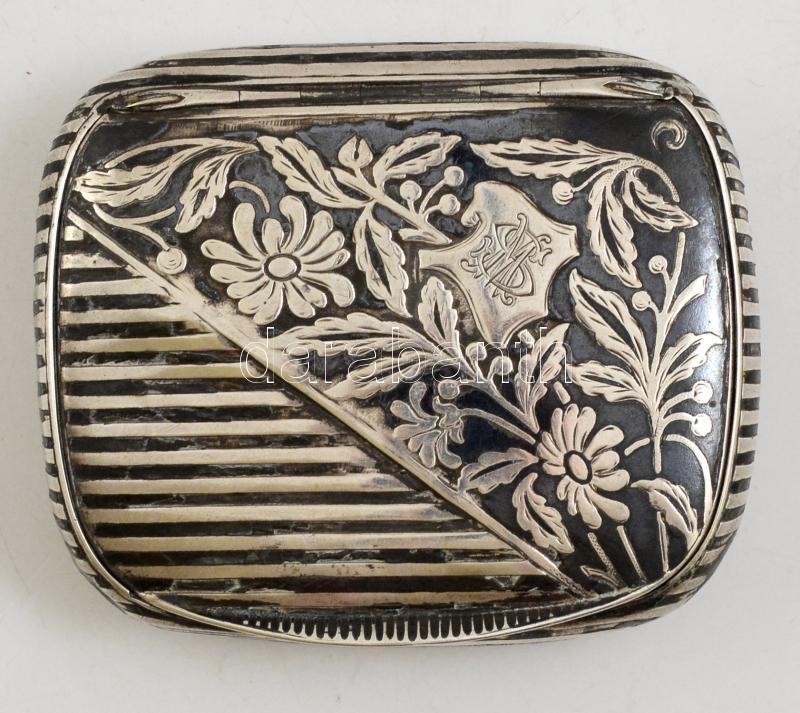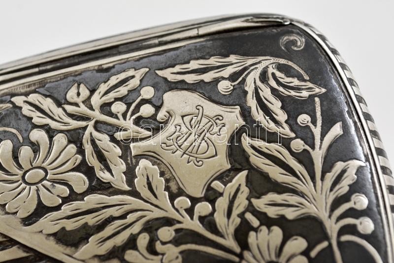 Virágmotívumos ezüst (Ag.) cigarettatárca monogrammal, jelzett, 9,5×8×...