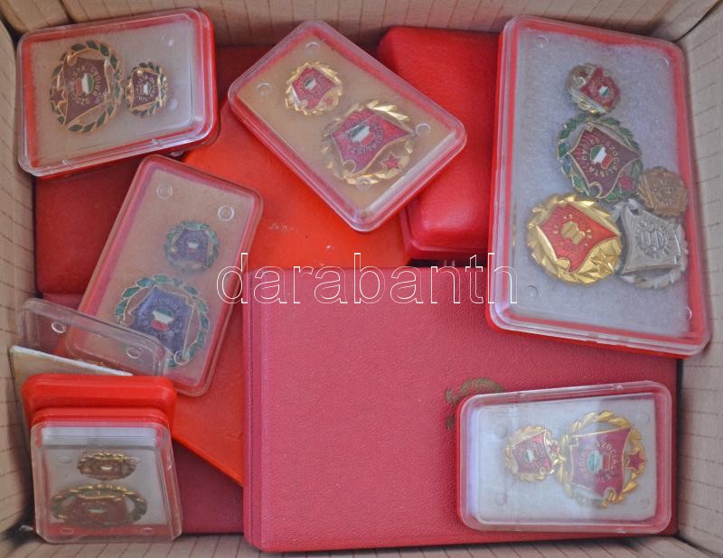 Description: 25db-os vegyes tétel a szocialista korszakból, közte "Szocialista Brigád" jelvények, "A haza, a nép hűséges szolgálatáért" Br kitüntetés mellszalagon, "Kiváló Termelőszövetkezeti Dolgozó" aranyozott, zománcozott kitüntetés, minden tokban T:2