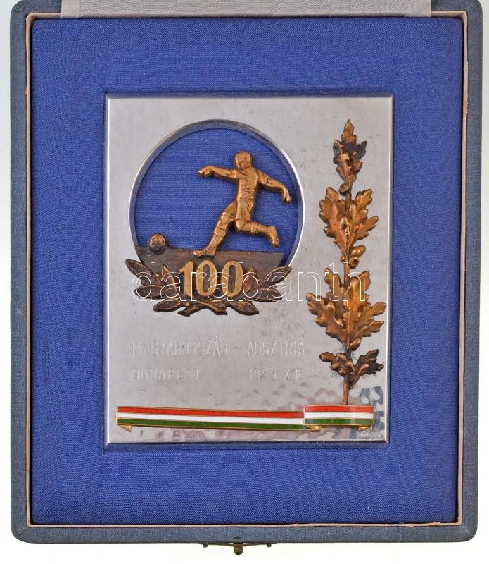 Description: 1955. "Magyarország - Ausztria Budapest 1955. X. 16" a századik osztrák-magyar labdarúgó mérkőzés emlékére kiadott, részben zománcozott plakett, eredeti dísztokban. Szign.: Miticzky T:1-