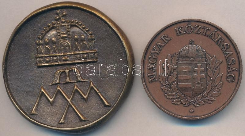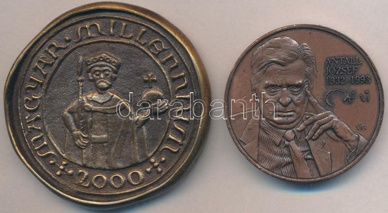 Description: Asszonyi Tamás (1942-) 2000. "Szent István - Magyar Millenium" Br emlékérem, mesterjegy nélkül (55mm) + 1993. "Antall József 1932-1993 / Magyar Köztársaság" fém emlékplakett. Szign.: VG (42mm), a két érem egy kis bársony zsákban T:2,2-