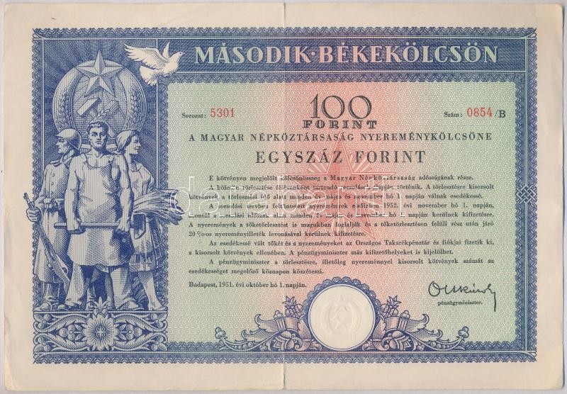1951. "Második Békekölcsön" nyereménykölcsön 100Ft-ról szára...