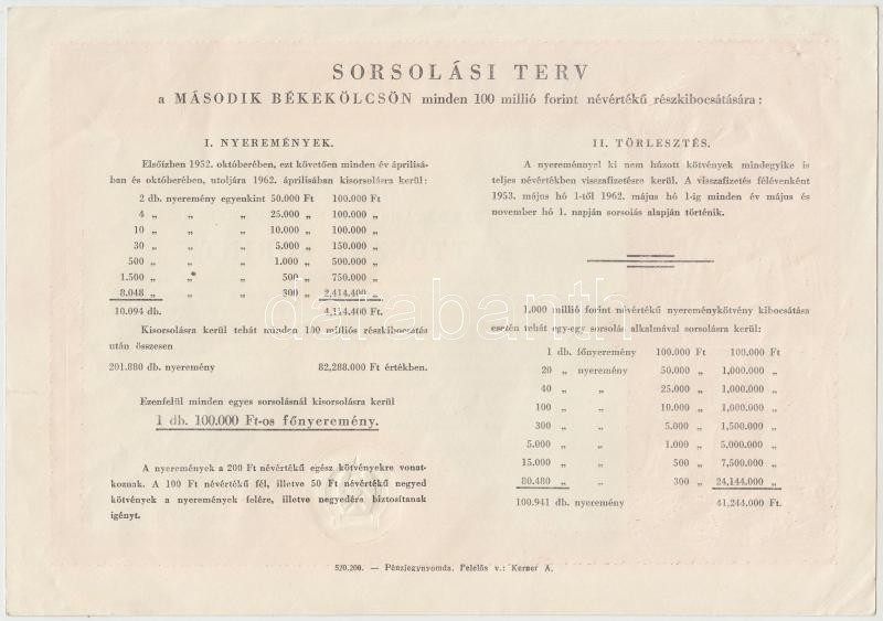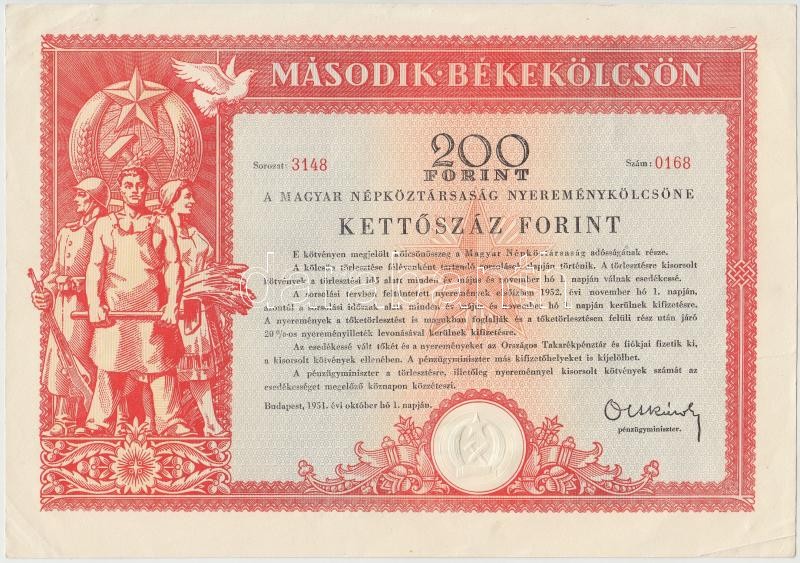 Budapest 1951. "Második Békekölcsön" nyereménykölcsön kötvén...