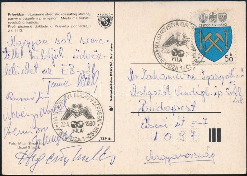 1980 Prievidza, Csehszlovákia, Birkózó EB néhány résztvevője, többek között Ronyai János, Toma Mihály, Növényi Norbert aláírásaival