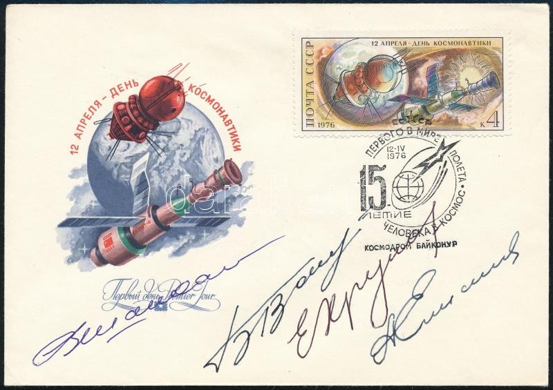Jevgenyij Hrunov (1933-2000), Vlagyimir Satalov (1927- ), Alekszej Jeliszejev (1934- ) és Borisz Volinov (1934- ) szovjet űrhajósok aláírásai emlékborítékon /