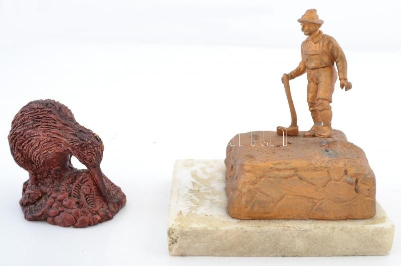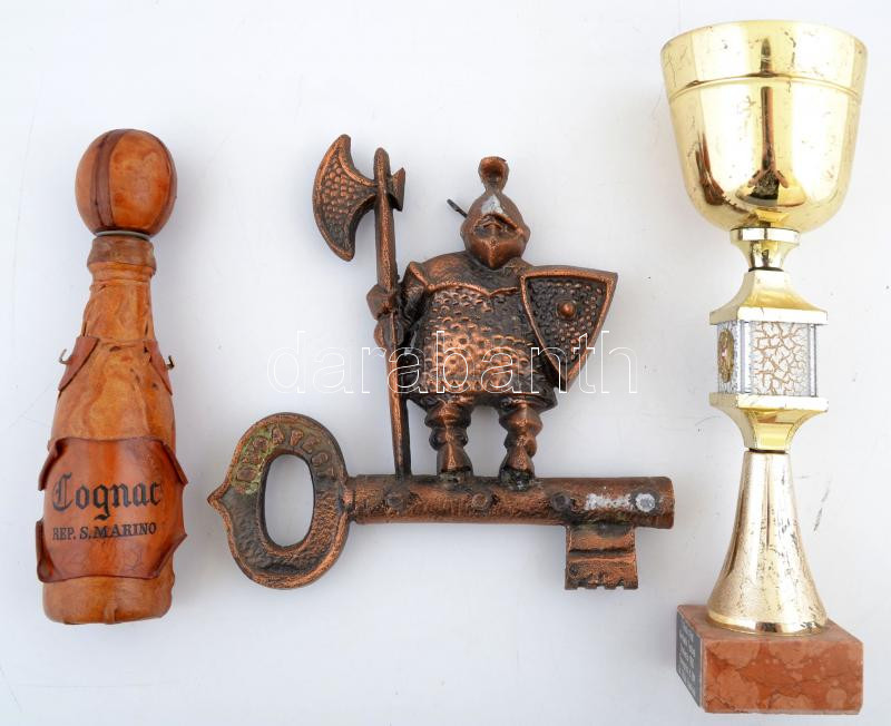"1. Rock 'n' Roll Akrobatik Festival Stockerau 1990" feliratú kupa, rajta az osztrák címerrel, m: 30 cm + "Cognac Rep. S. Marino" feliratú, bőrborítású italosüveg, m: 23,5 cm + kiwit formázó új-zélandi szuvenír, fa, m: 7 cm, "Budapest" feliratú dekoratív fali fém kulcstartó, 23×22 cm, Favágó, festett fém szobor, alabástrom talapzaton, jelzés nélkül, sérült, m: 13,5 cm
