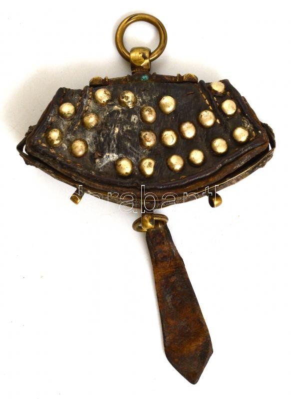 Lőportartó táska, keleties fém veretes díszítésekkel, 12x8x4 cm