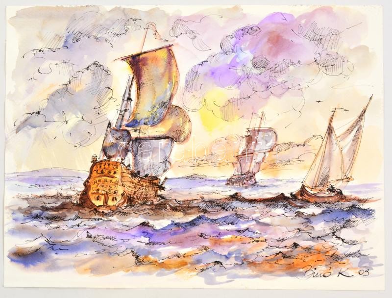 Binó jelzéssel: Hajók, akvarell-tus, papír, 24×32 cm
