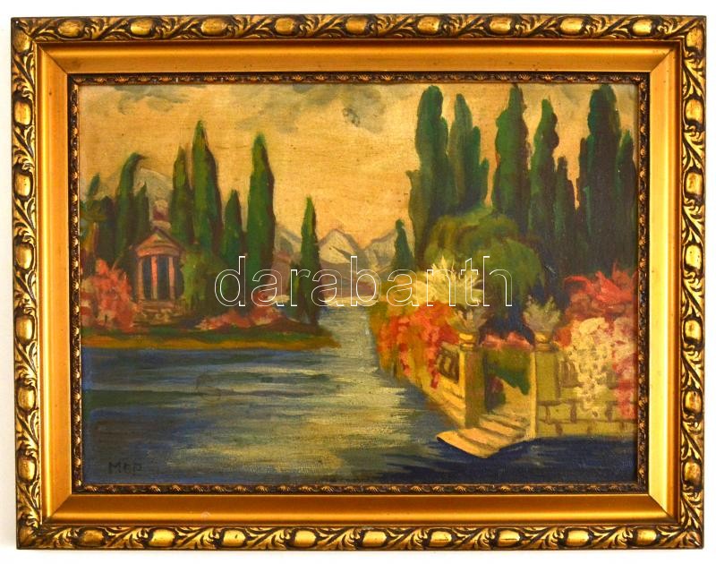 MCP jelzéssel: Mediterrán táj hegyekkel. Olaj, karton, keretben, 24×34...