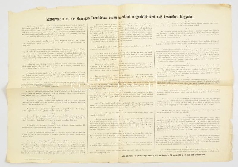 1929 Szabályzat a m. kir. Országos Levéltárban őrzött iratoknak magánfelek által való használata tárgyában, szakadt, 42x59 cm