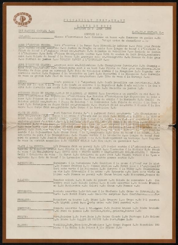 1936 Budapesti Piccadilly Restaurant étlapja, francia nyelven