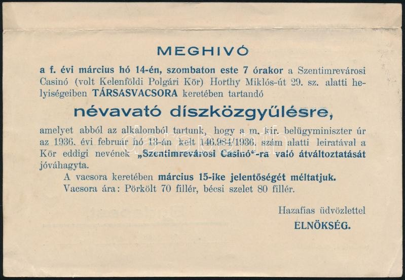 1936 Meghívó, Szentimrevárosi Casinó névavató díszközgyűlésére, 10,5x1...