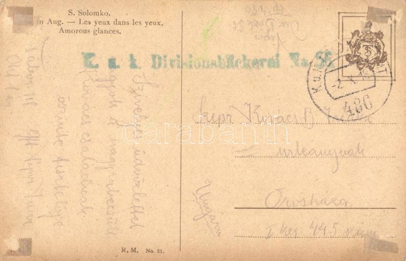Amorous glances. Russian art postcard. T.S.N. R.M. No. 12. + K.u.K. Divisionsbäckerei No. 56. s: Solomko (Rb)