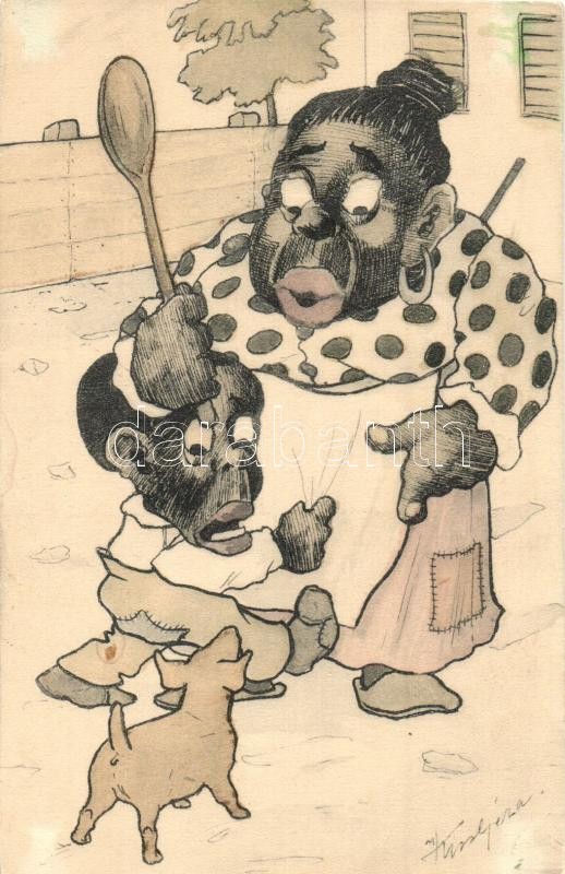 Black family, dog. Original hand-drawn art postcard. s: Kiss Géza