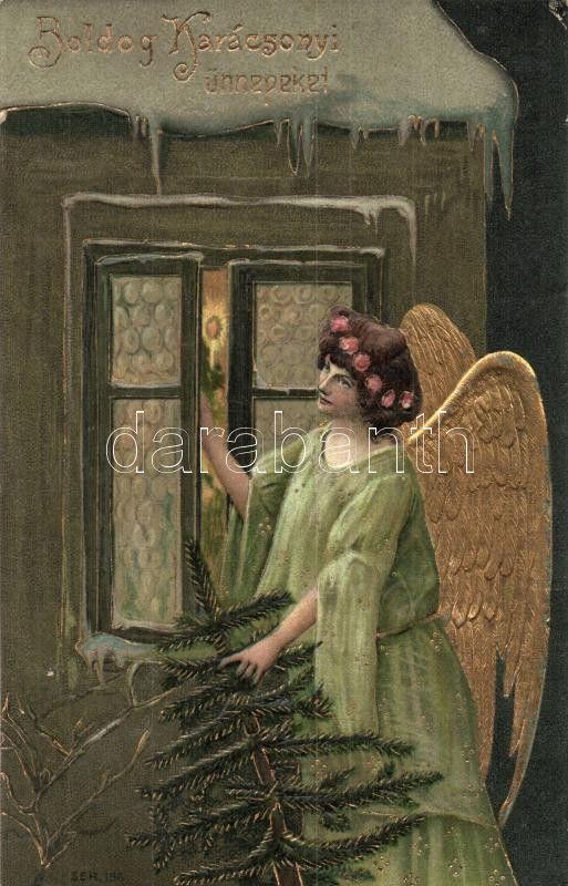 Boldog Karácsonyi Ünnepeket! / Christmas greeting art postcard, angel with pine tree. Golden decorated Emb. litho (EK)