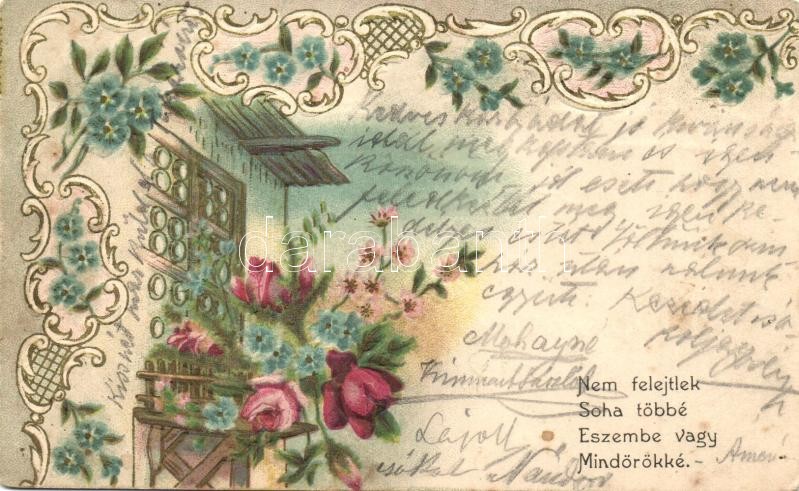 Nem felejtlek soha többé, Eszembe vagy mindörökké / Romantic greeting card. floral Art Nouveau litho (EK)