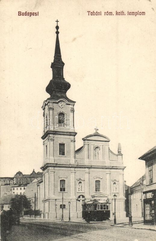 Budapest I. Tabán, Római katolikus templom, villamos, üzlet (EK)