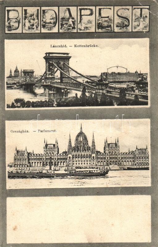 Budapest, Lánchíd, Országház. Fecskés üdvözlő montázslap / Greeting mo...