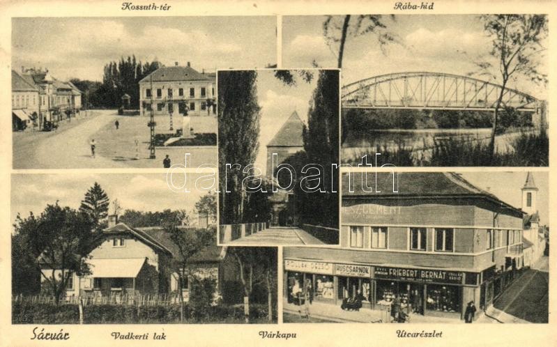 Sárvár, Kossuth tér, Rába híd, Vadkerti lak, Várkapu, utcakép, Pollák Rezső, Húscsarnok és Friebert Bernát üzlete