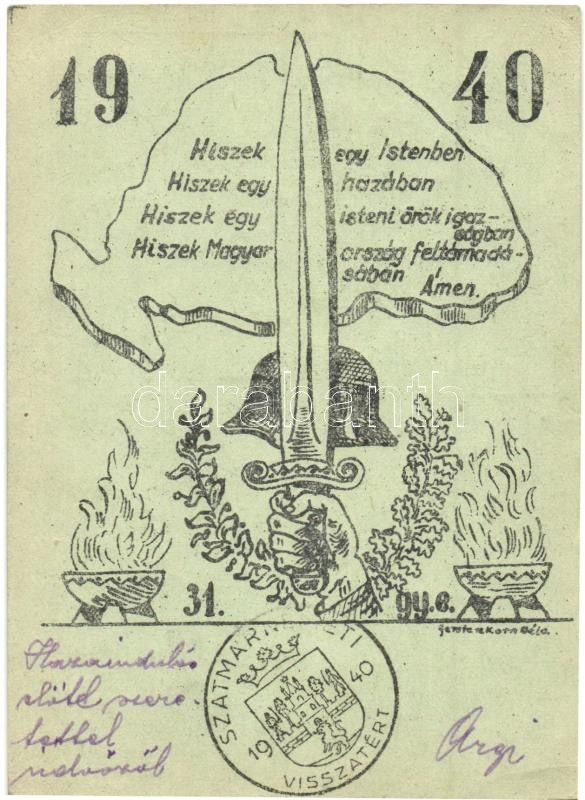 Description: 1940 Hiszekegy. Tábori Postai Levelezőlap / WWII Hungarian military field post, irredenta. s: Gersternkorn Béla + 1940 Szatmárnémeti visszatért So. Stpl. (EK)